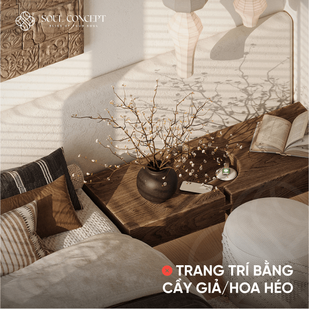 Hoa và cây xanh mang lại năng lượng sống động cho không gian. Tuy nhiên, việc sử dụng cây giả hoặc hoa héo trong ngày Tết là điều kiêng kỵ, vì chúng biểu trưng cho sự thiếu sức sống, trì trệ và không may mắn.