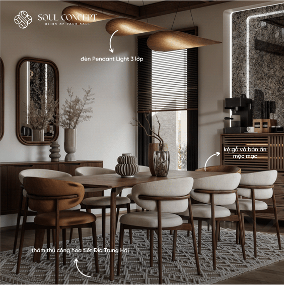 Phòng ăn là nơi sự kết hợp tinh tế giữa hai phong cách được thể hiện rõ rệt. Thảm thủ công được đan khéo léo từng họa tiết nhỏ, gợi nhớ đến hình ảnh những con sóng lăn tăn của vùng Địa Trung Hải, trải dài dưới bàn ăn mộc mạc. Chất liệu tự nhiên như gỗ và mây được sử dụng để tạo nên một không gian vừa thoáng đãng, vừa gần gũi thiên nhiên, đúng với tinh thần của cả hai phong cách.